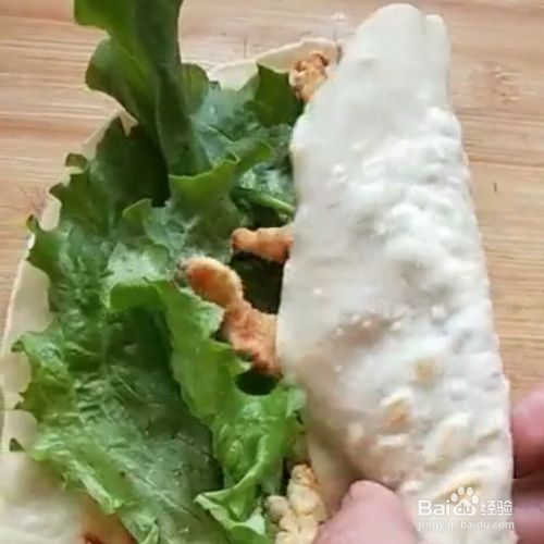 饼上刷一层酱,放黄瓜丝,生菜,香葱,鸡柳。