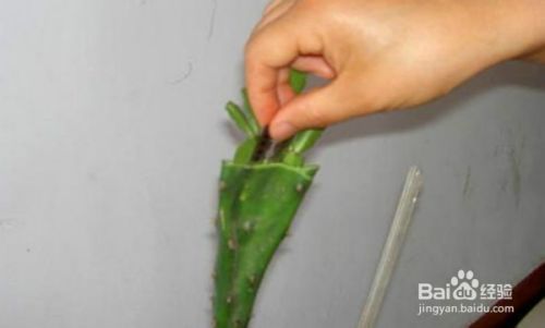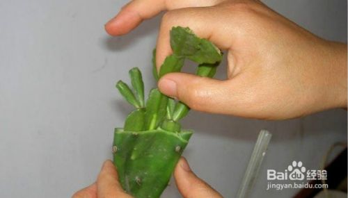 把仙人掌顶端的切口,沿着“经络部位”切缝,把蟹爪兰的乔本插入切开的缝隙,缝隙大小以刚好插入为宜。如下图所示。
