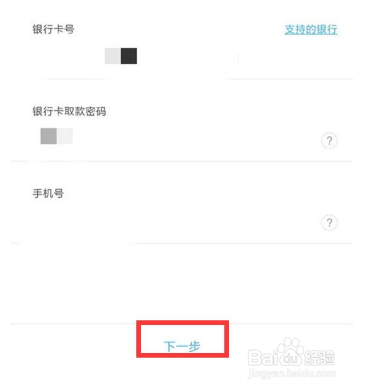添加银行卡,填写卡号,密码,手机号,然后点击“下一步”。