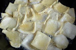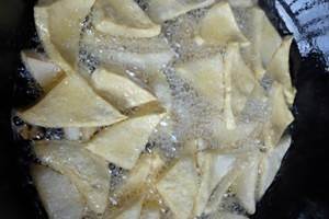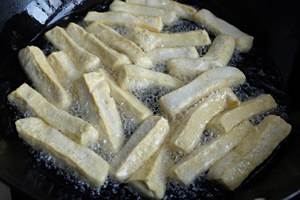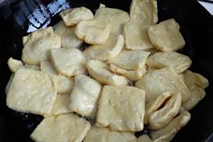 热锅,锅要烧热后,再放油,(这样豆腐不会粘锅)油炸嘛,油还是要多的!油烧热,可以放一块豆腐下去试试,周围冒泡就可以了切好的豆腐下油锅,刚入锅的时候不要翻动,豆腐易碎。
