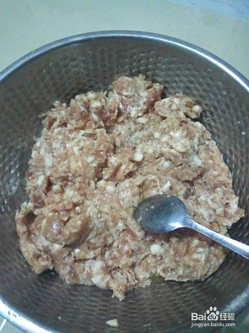 肉切碎放姜片腌一下后去掉姜片,放适量盐、胡椒粉、酱油、料酒搅匀备用。