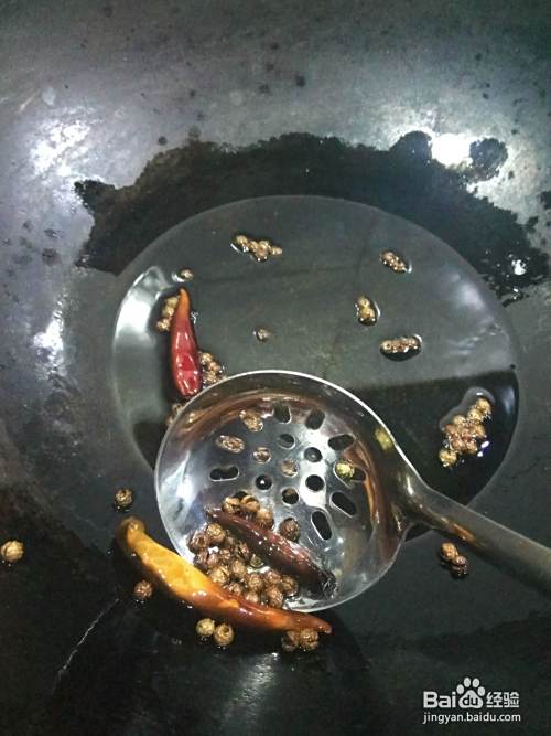 锅倒油,油热放干辣皮、花椒炒香后去掉辣皮花椒,把油泼在肉上搅匀。