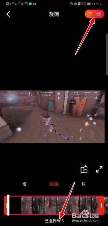 进入视频裁剪界面,在页面下方可以看到已选择60秒的长视频,点击右上角的下一步;