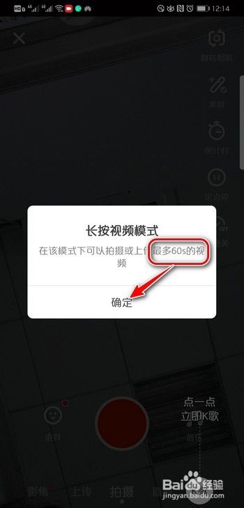 页面弹出长按可拍摄或上传60秒的视频,点击确定;