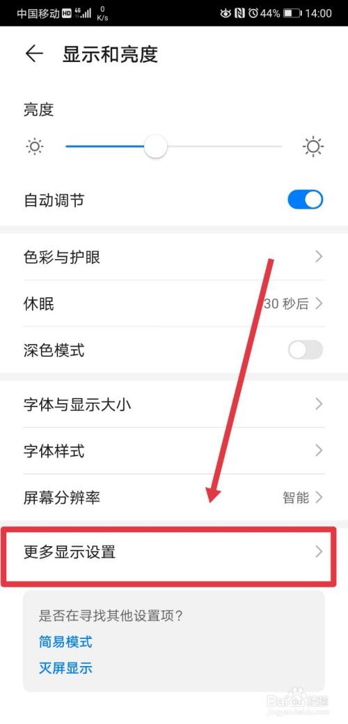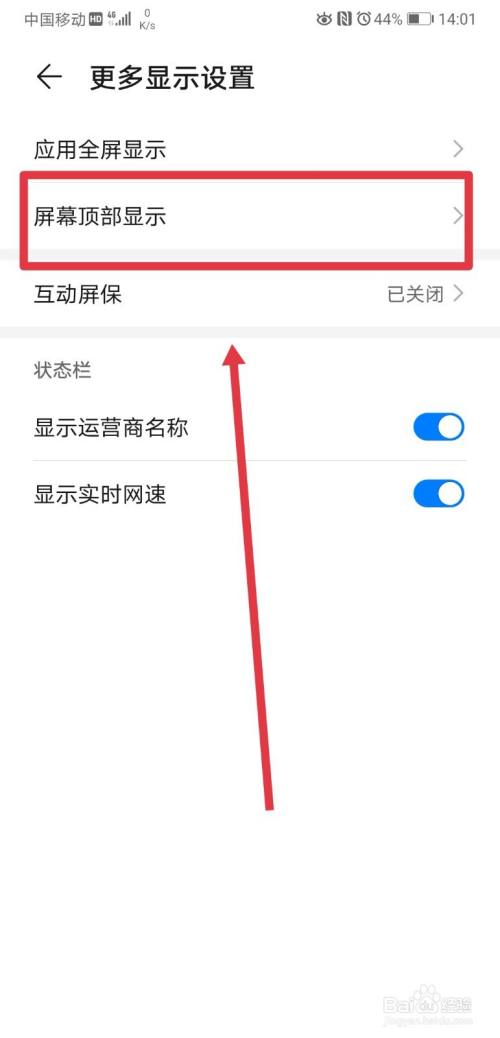 在更多显示设置页面,找到“屏幕顶部显示”功能,点击进入;