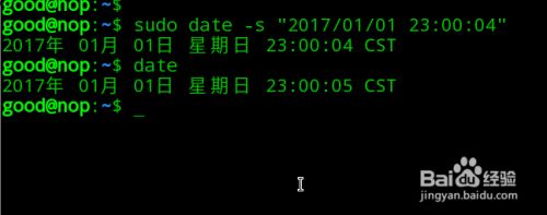 可以通过date命令来设置时间和日期,比如下图所示,将系统时间设置为2017年1月1日的23点0分4秒。