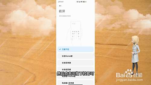 点击按键快捷方式页面的截屏,然后点击三指下拉即可。