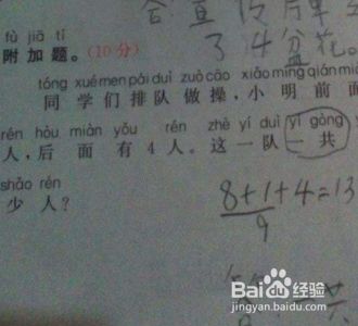 最后还会有一条附加题,虽说是附加题,但难度一点都不高,这分数也是很好拿的,像这个小明前面有8人,后面有4人,一共有多少人,有的小朋友会直接8加4,少算了小明自己的1,这个可以让小朋友自己想象一下排队的实际情况,增加空间思维能力。