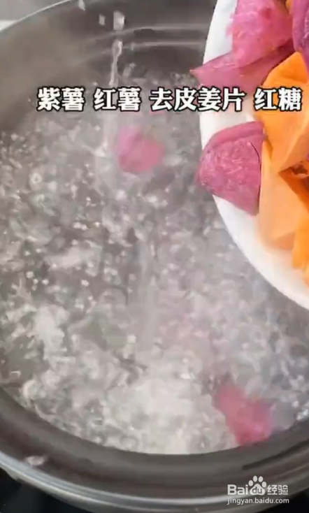 接着放入紫薯,红薯,去娃沟皮姜片,红糖搅拌均匀