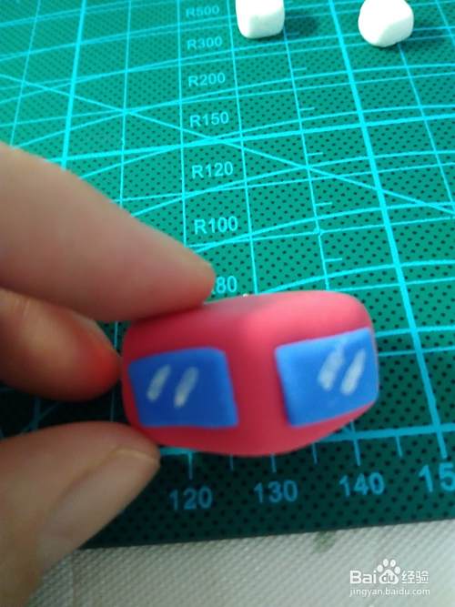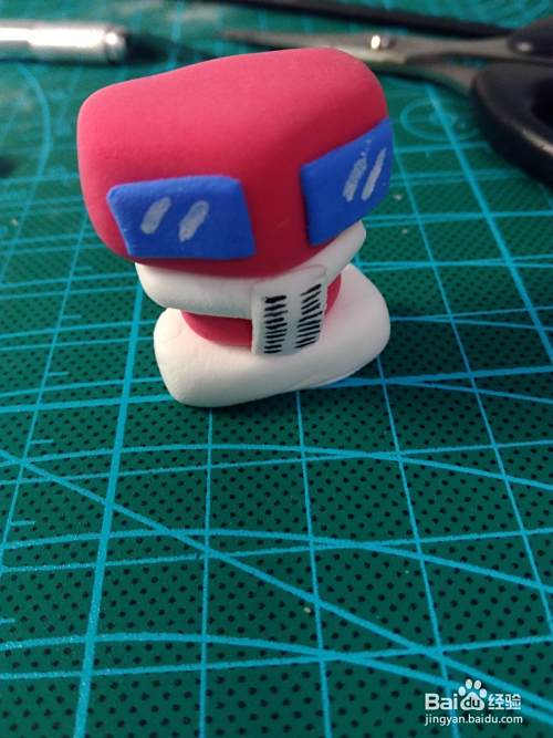 下一步制作身体,红色粘土捏成如图的块状后,蓝色粘土压成片,剪成两个等大的长方形,并用高光笔画出反光部分,这部分就是车头和车窗,也是变形金刚的身体