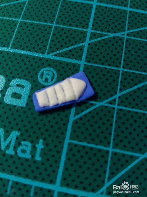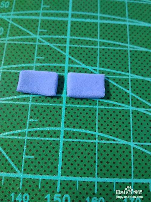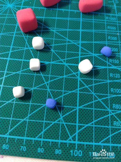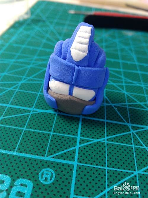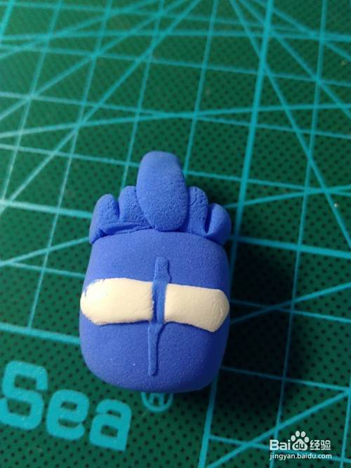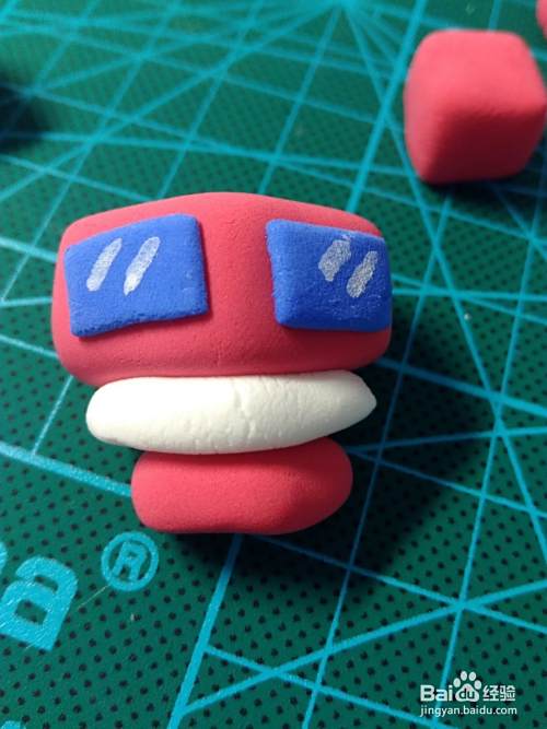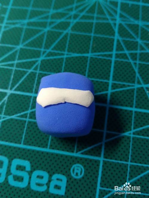 首先是做头部,蓝色粘土捏成方块,白色粘土压成片,剪出眼睛部分的形状,贴在头上