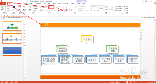 选择整个结构图——HOME——字号,统一设置为20——居中对齐。部分文本框可以根据实际设置左对齐。