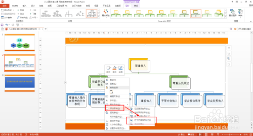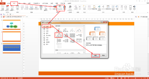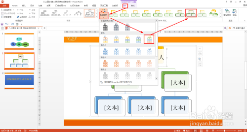 SMARTART工具——设计——更改颜色——彩色范围 着色5至6——选择卡通的SMARTART样式。