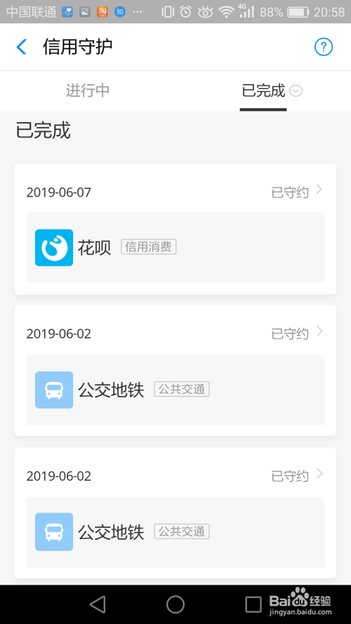 3第三步: 回到“芝麻信用”界面,点击最下面的“信用守护”,在这里你会看到你的履约情况。所以要想获得高的芝麻信用分,那么你就要按时完成履约,比如多使用支付宝乘坐公交地铁,按时还花呗里的欠款,这些都会让你的芝麻信用一点一点的增长。   END END
