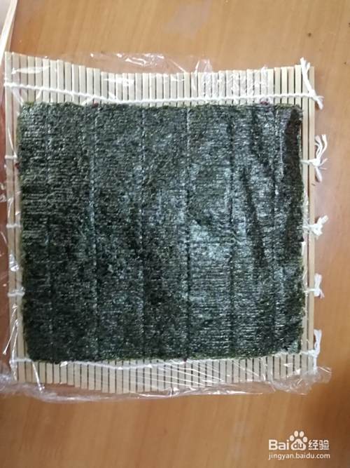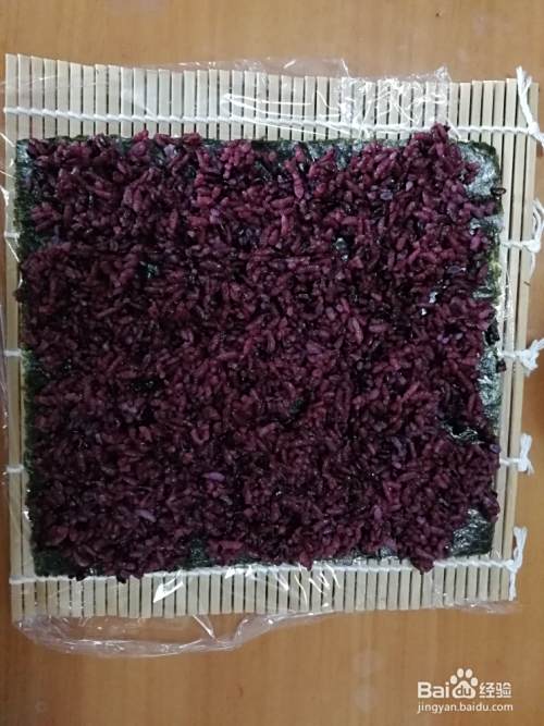 撒上一片海藻,再撒上黑米。同时,准备一碗水和寿司醋混合。如果手是粘的或寿司刀是粘的,蘸些水保持米饭的味道不变。