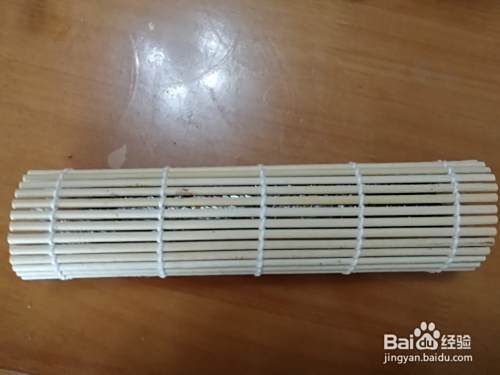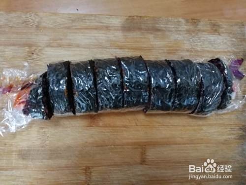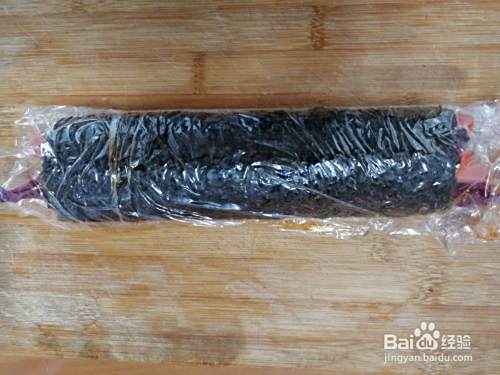 打开寿司席,再把保鲜膜卷上去,包在寿司卷上面,可以想切块的时候再切,起保湿作用。