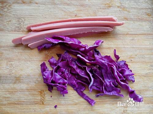 香肠,生紫甘蓝片。把紫甘蓝直接洗干净。