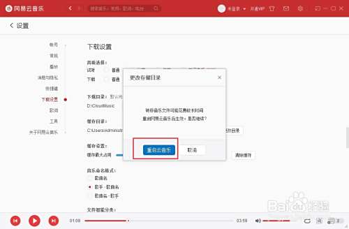 这时会出现“转移音乐文件可能花费较长时间,重启网易云后生效。是否继续?”的提示,选择“重启云音乐”即可完成下载路径的修改。