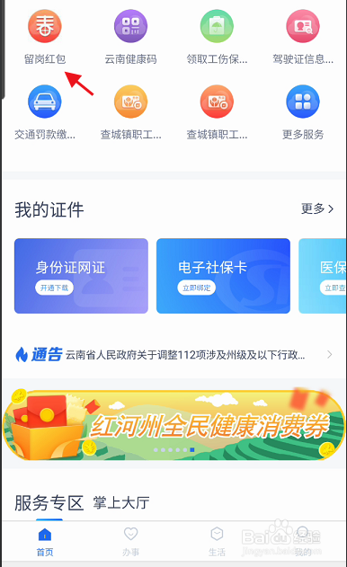 进入首页,找到上方的留岗红包,点击进入