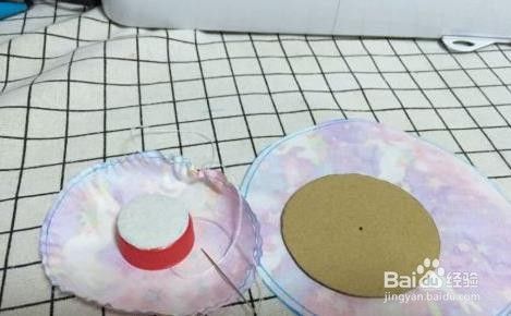 如图在两块圆布外圈疏缝,针距不宜太大,将瓶盖和帽檐包好