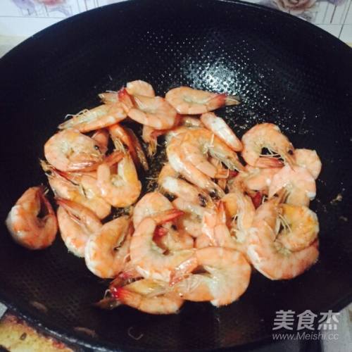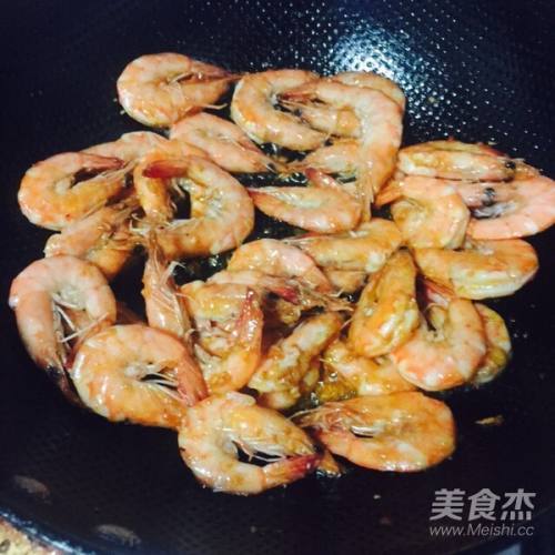 6冷锅入油,放入我们腌制好的大虾,煎至两面金黄色(用筷子将虾翻面能保证其虾的完整)捞出