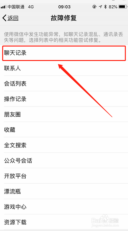 待我们进去:recover界面之后,我们可以看到如下图所示:这是一个故障修复功能!我们在此可以使用微信自带恢复功能修复聊天记录,联系人等数据!当然,我们主要是为了修复聊天记录,点击“聊天记录”选项进入下一步即可!
