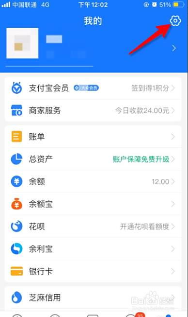 打开支付宝,点击我的,进入我的页面,点击右上角设置