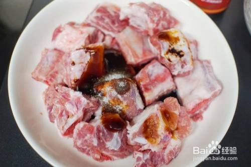 排骨加入盐、蚝油、冰糖老抽酱油和料酒抓拌均匀
