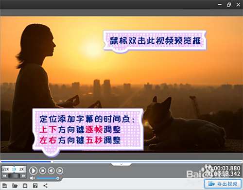 首先在视频预览框时间进度条上,单击要添加字幕的时间点,然后双击视频预览框,在弹出的“输入文字”框内输入文字内容,点击“确定”按钮。