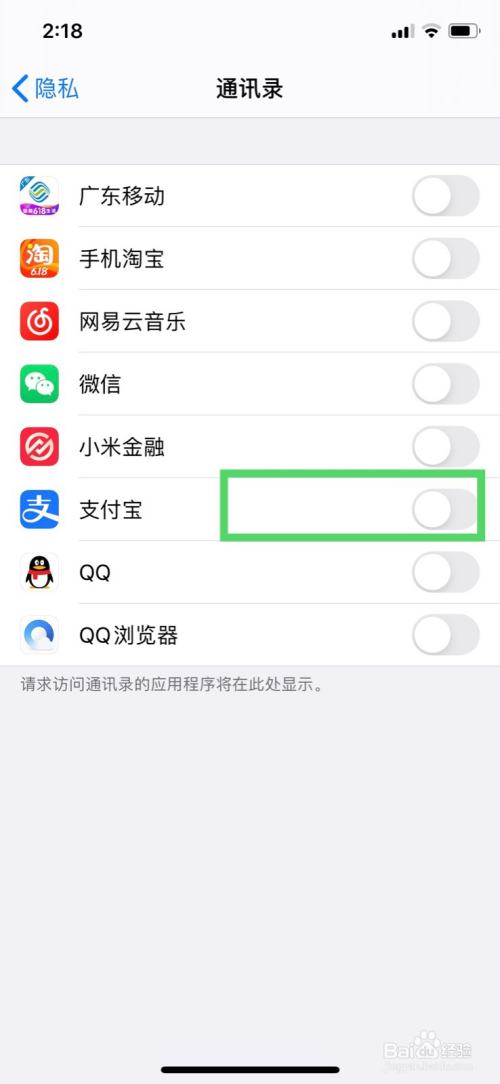6、开关标签圆点内变白,关闭支付宝访问通讯录。