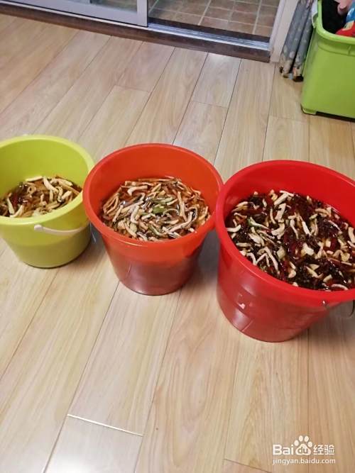 依次地往其他桶内也加入搅拌好的配料水,后把干萝卜丝放入,根据个人口味自行加入其他大料,如图所示。