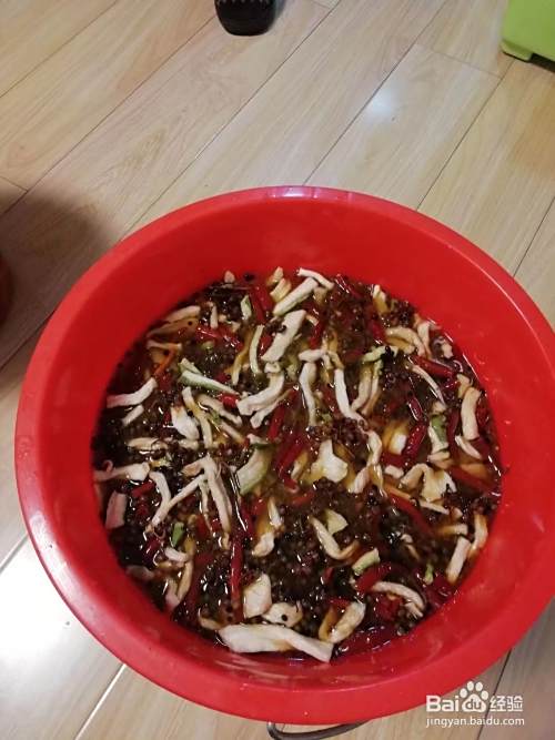 用烧好的开水一定要冷凉后,用凉白开水今天泡,同时把水和白酒,陈醋,白糖,食盐,生抽在一起溶化下,后加入到小桶内1/3处,这时加入适量的干萝卜丝和干辣椒或花椒材料等,如图所示。
