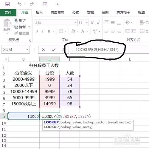 首先我们看到“分段”这一列的顺序是乱的,那么我们如何进行lookup的查找,查找分段列返回人数列的值呢,如下图所示:
