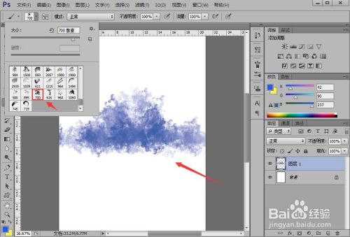 选择笔刷,新建文件图层,在工具栏中选择“笔刷”,尝试用画笔工具画一下。(还可以,调节笔刷大小,和笔刷硬度)