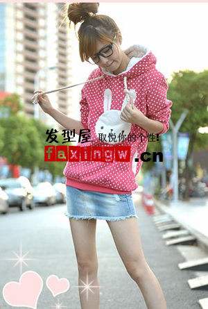 知性、文气的齐刘海盘发,整齐的刘海配搭一件大框眼镜,可爱甜美,后部的编织盘发,UPUP发型的时尚和精致。