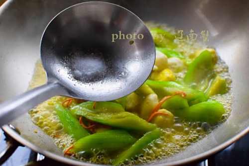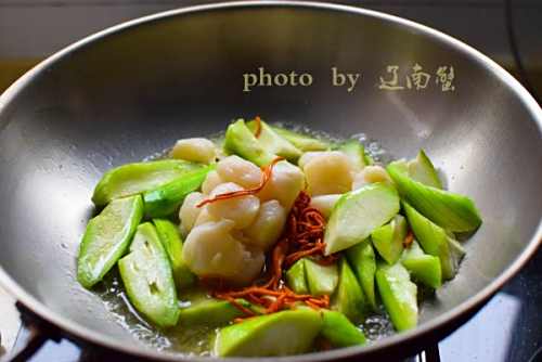 4再下丝瓜和虫草花翻炒。之后加入鱼丸。