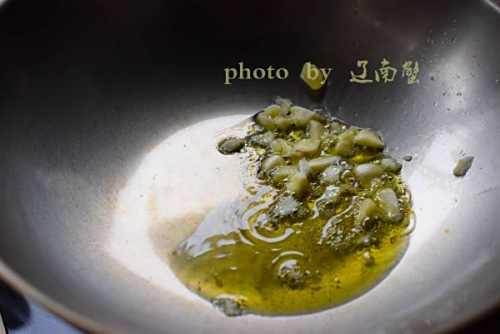 3炒锅倒油加热,先下大蒜碎炒香。