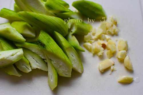 2丝瓜去皮切滚刀块,大蒜去皮切碎。