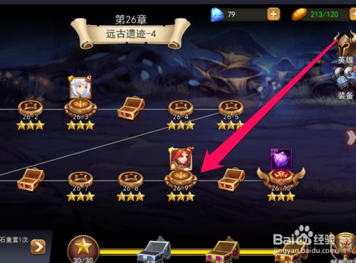 找到冒险的关卡,点击挑战,查看奖励获得女神碎片。
