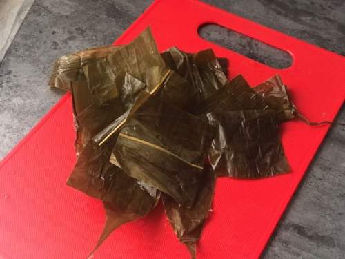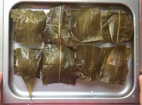 4将粽子叶依次摆在烤盘或蒸帘上。