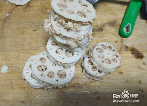 第五,把调好的肉馅放到两篇藕片中间,让两篇藕片加紧肉馅,当然肉馅越多越好吃,然后把夹有肉馅的耦合I,放入提前准备好的面粉糊中,如下图所示;