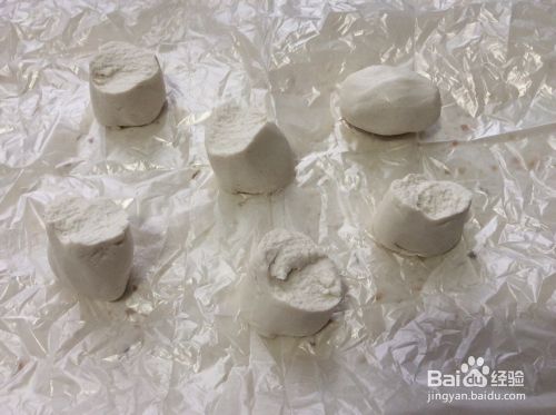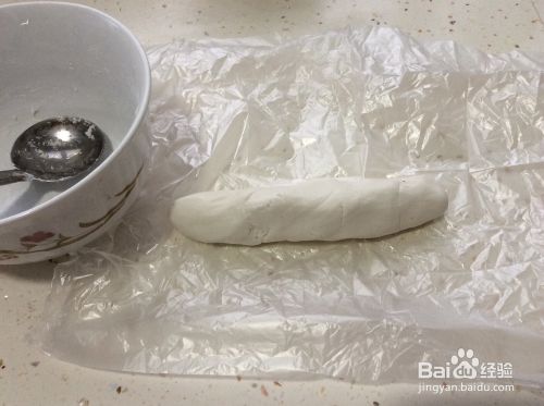 将糯米面团搓成直径4厘米的长条形,用手掰成4厘米长的段。