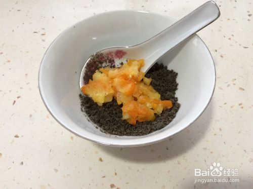 将切细的金桔放入熟芝麻粉中,和匀。再加入食用油和匀、压实。金桔芝麻馅就做好了。