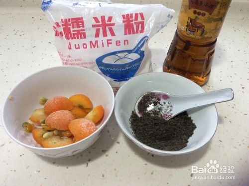 准备食材:糯米粉、蜜制金桔、熟芝麻粉、食用油。