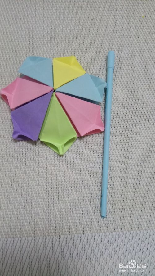 将伞把儿插进雨伞里,用胶水稍微固定一下,漂亮雨伞就做好了。