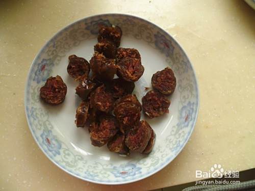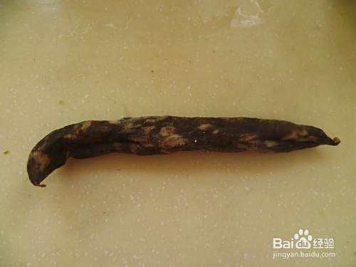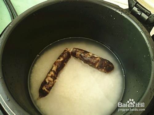 取一根年前灌制的腊肠,洗净放入电饭锅。