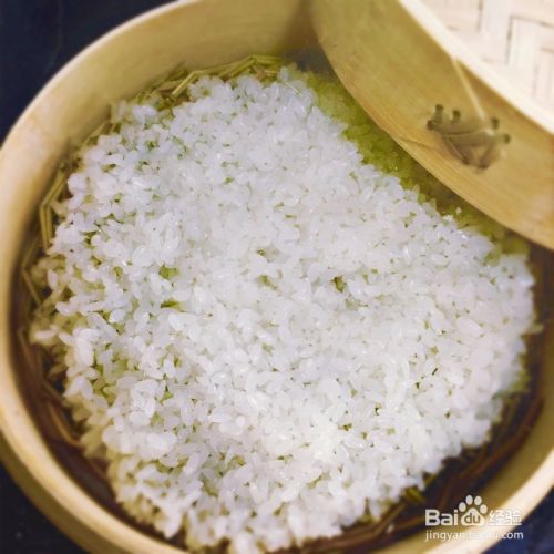 将糯米洗净,浸泡5个小时后沥干水分,蒸1小时备用。