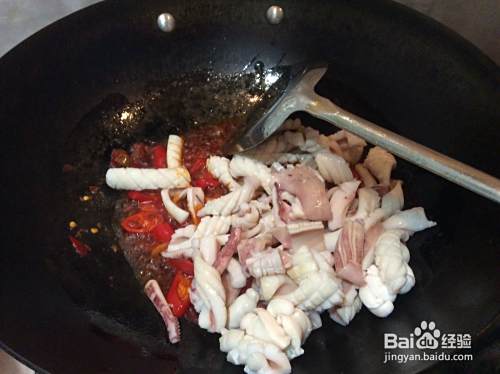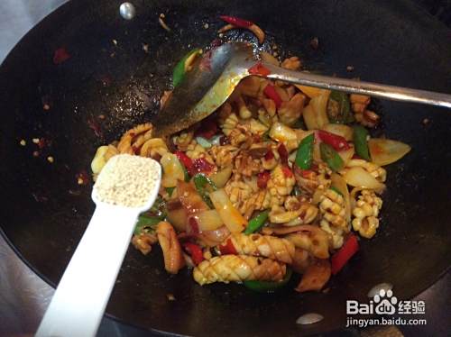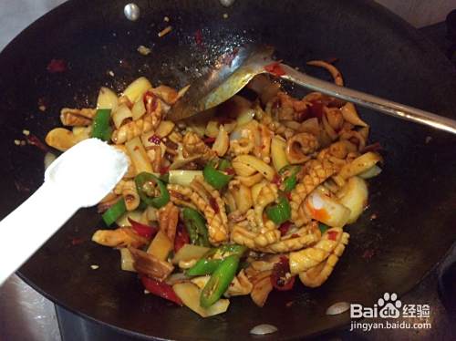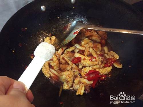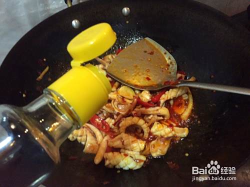 倒入鱿鱼翻炒,加入酱油、白糖调味,继续翻炒。