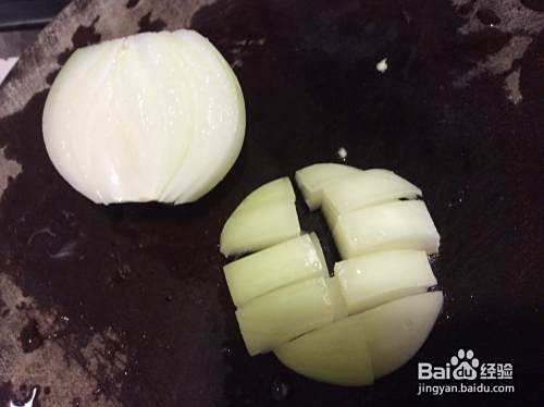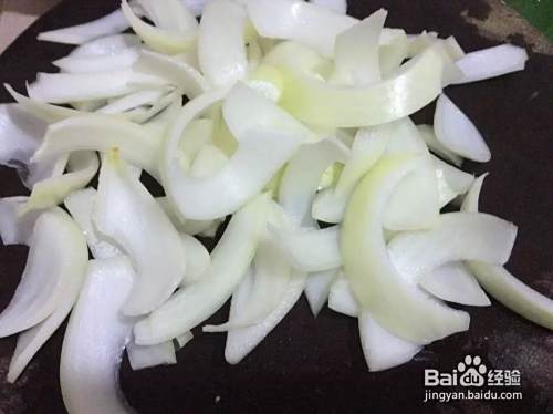洋葱去除最外层皮,去蒂,洗净后对剖成两半,再将每半切成1厘米左右宽、2厘米左右长的条,撒开。