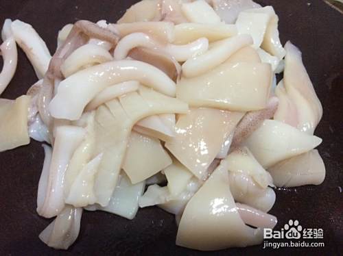 将鱿鱼肚子剪开,撕掉鱼肚中的鱼骨等内物,撕掉鱿鱼外面的黑皮,洗净后将鱿鱼头部及须剪成一根一根,较长的剪断;将鱿鱼身子部份肚皮朝上打花刀,然后切成4厘米左右长、2厘米左右宽的段。